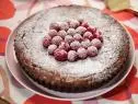 In a mixing bowl fitted with the whisk attachment, beat the eggs with the remaining 1 1/4 cups of sugar and coffee mixture on medium speed, about 5 minutes. With mixer on low, add the chocolate-butter mixture, followed by the cocoa-hazelnut mixture. With a spatula scrape batter into prepared pan and bake for about 35 minutes, or until the top is glossy and a toothpick inserted in the center comes out with a few moist crumbs. Let cool until slightly warm.
