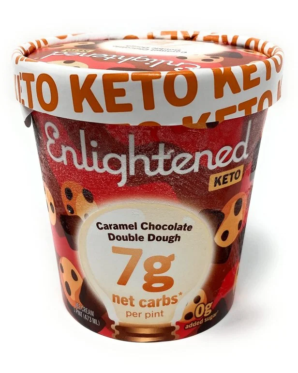 You may be familiar with this brand of low-cal ice cream, which contains 60 to 100 calories per half-cup serving, or 300 to 400 calories per pint. Enlightened is not as creamy as traditional ice cream, but it is nice and sweet. Light ice cream flavors include Cold Brew Coffee, Chocolate and Snickerdoodle. The new Keto Collection ice creams are higher in fat and calories but have only 6 to 8 net grams of carbs per pint, and come in flavors such as Keto Chocolate Glazed Donut and Caramel Chocolate Double Dough.
