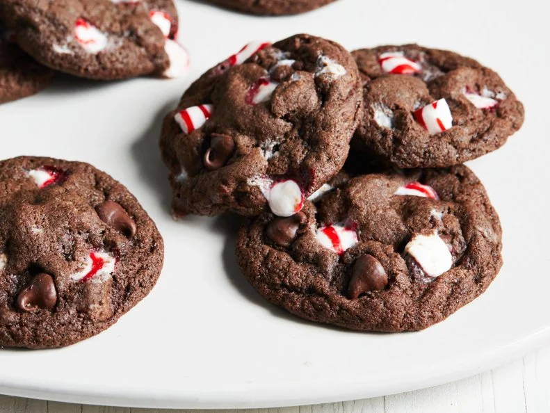Chocolate chip cookies are a favorite year-round — so we’ve updated them for the holidays. We use cocoa powder to give them a rich, chocolate base and press crushed peppermint candies into the tops of the cookies before baking.