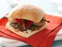 Grill the vegetables, turning rarely, over medium heat until soft and charred, about 5 minutes for the asparagus, 10 minutes for the onions, 15 minutes for the peppers and mushrooms. Take vegetables off the grill and put in a bowl. Add the pesto sauce to a small bowl and add the grilled mushrooms. Toss to coat the mushrooms with the pesto.