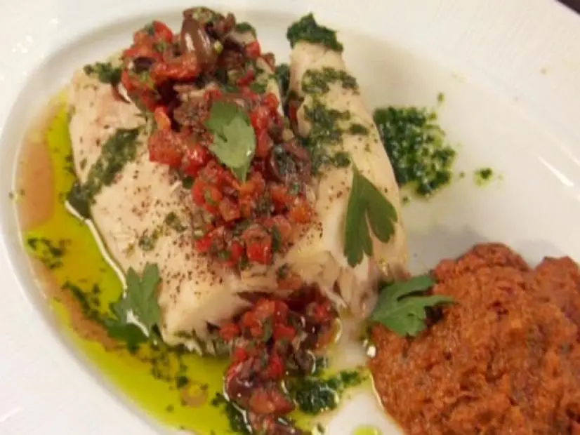 Arrange the fish on serving plates with the Yellow Pepper Romesco Sauce on the side. Top the fish with heaping mounds of the Parsley Garlic Oil and Red Pepper-Black Olive Relish. Garnish with parsley leaves and serve.