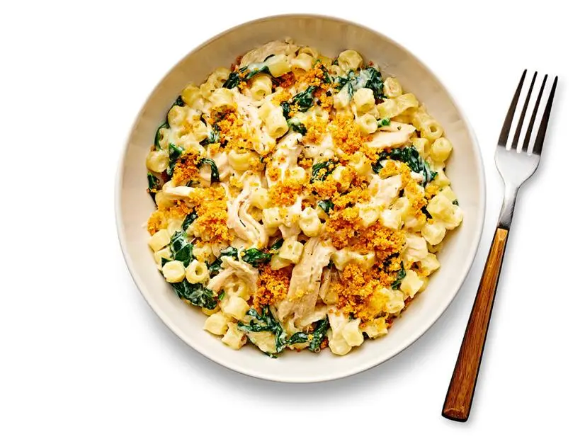 Stir in the chicken, spinach and pasta and cook to heat through. Stir in the gruyère and season with salt and pepper. Divide among 4 bowls and top with toasted breadcrumbs.