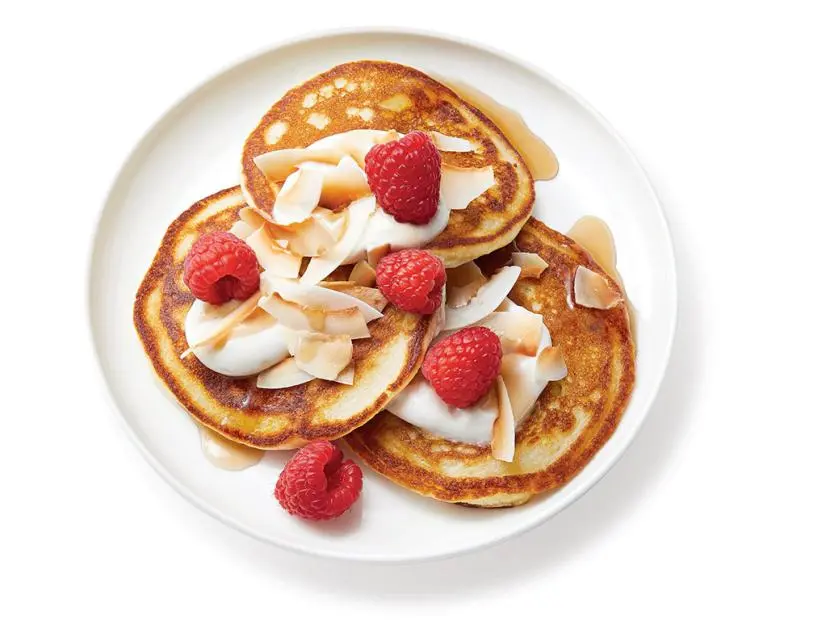 Heat a large nonstick skillet over medium heat; brush with coconut oil. Add 1/4 cupfuls of batter to the pan, leaving room for the pancakes to spread. Cook until the pancakes are puffed, the edges are set and the bottoms are browned, 4 to 5 minutes. Flip and cook until browned on the other side, 1 to 2 more minutes. Transfer the pancakes to a baking sheet and keep warm in the oven. Repeat with the remaining batter, adjusting the heat if the pancakes are browning too quickly.