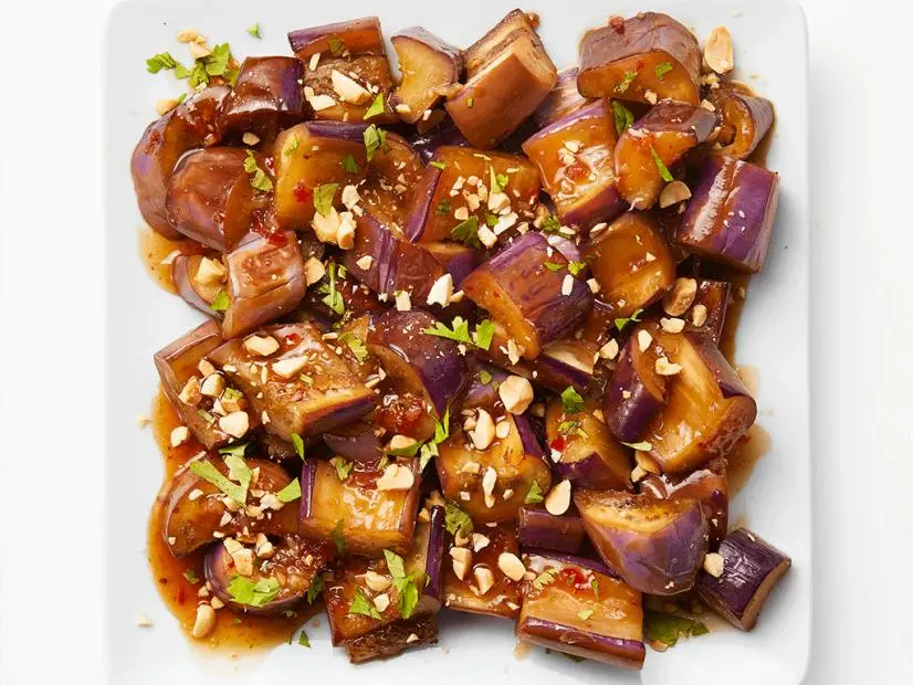 Mix 2 tablespoons each water and oyster sauce, 2 teaspoons chili-garlic sauce, 1 1/2 teaspoons fish sauce and 1 teaspoon sugar; set aside. Cut 4 small Japanese eggplants in half lengthwise, then cut into 1 1/2-inch chunks. Cook in 3 tablespoons vegetable oil in a nonstick skillet over medium-high heat until tender, 6 to 8 minutes. Add the sauce mixture. Simmer, tossing, until glazed, 30 seconds to 1 minute. Top with chopped peanuts and cilantro.
