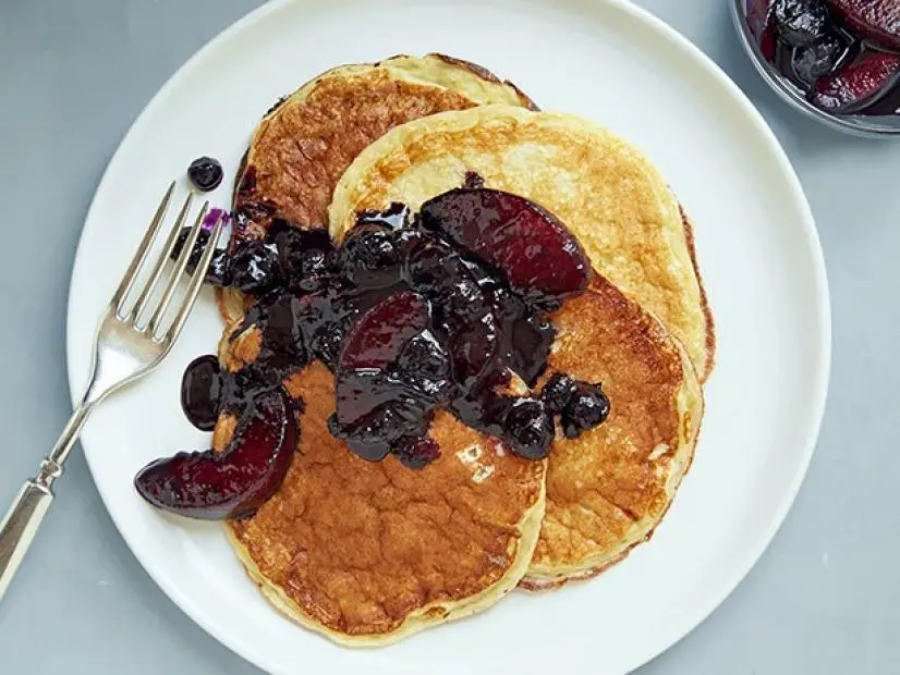 The perfect hybrid of flapjacks and crepes, these protein-packed pancakes are low in calories and fat. The blueberry-peach sauce is made without any added sugar, relying for sweetness on the natural sugars from the fruit and pineapple juice.