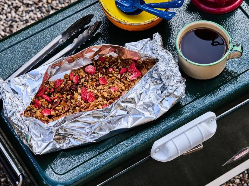 This crunchy (and addictive!) granola includes freeze-dried strawberries, which add a light texture and natural sweetness to the mix of oats, rice cereal, coconut and pecans. It’s remarkably easy and perhaps unexpected to make this granola on an outdoor grill in a foil pack. Just be sure to position the packet on the cooler side of the grill so the granola doesn’t brown too fast before it has a chance to fully bake.