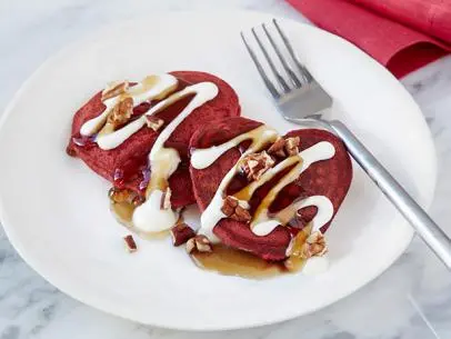 To serve, drizzle the cream cheese and syrup on top of the pancakes and sprinkle with pecans.