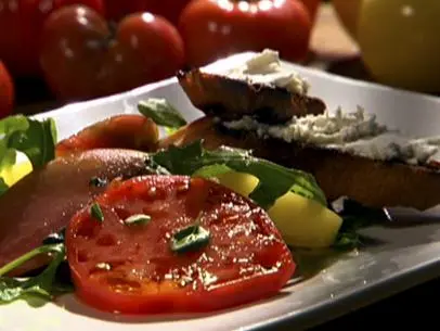 Toss the cherry tomatoes with the parsley, 1 tablespoon olive oil, a pinch of salt and a pinch of pepper. Pile them next to the shingled tomatoes. Toss the arugula in 1 tablespoon Cucumber Herb Dressing and place on the center of the platter.