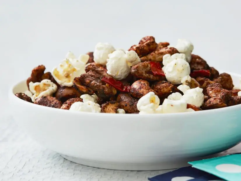 A mix of cashews, macadamia nuts, peanuts and walnuts get a spicy kick from chipotle powder and crumbled dried chiles. Tossing the nuts with bacon and popcorn completes this addictive snack.