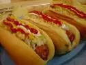 Remove a roll from the steamer. Put a hot dog into it and top with some onion, cabbage, and crushed chips. Squirt on some mayonnaise, mustard, and ketchup and enjoy!
