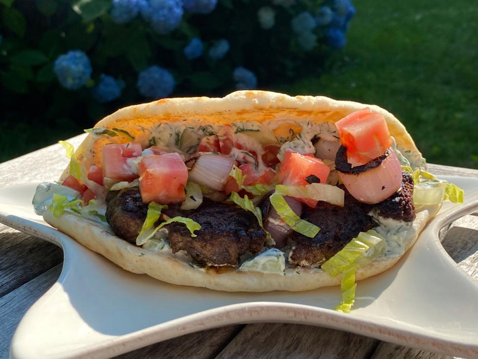 Gyro-Style Lamb Burgers with Tzatziki and Grilled Onions