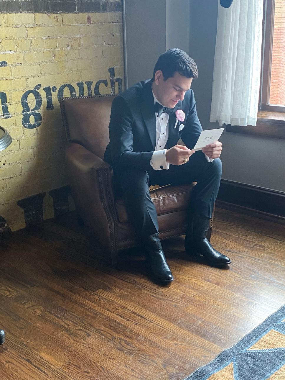 Meanwhile, the groom takes a quiet moment to himself to read a letter his bride-to-be wrote.