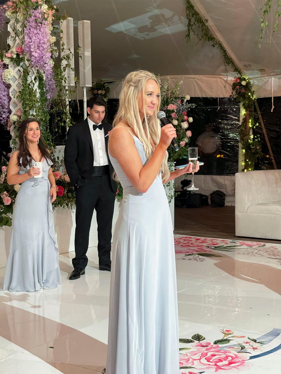 Alex's sister, Paige, gives an incredibly sweet speech at the reception, and she's sure to tell the groom that he has "one hell of a wife!"